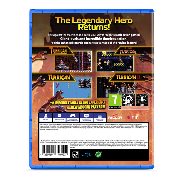 Turrican set the world ablaze with its sprawling levels, high-octane action and the unforgettable soundtrack by Chris Huelsbeck. Relive 4 masterpieces from the series in a brand new way, with enhanced controls that makes the games feel better than ever, and customize your experience with all new options to enhance the visuals. This is the return of one of gamings' greatest heroes! Welcome back... TO TURRICAN!